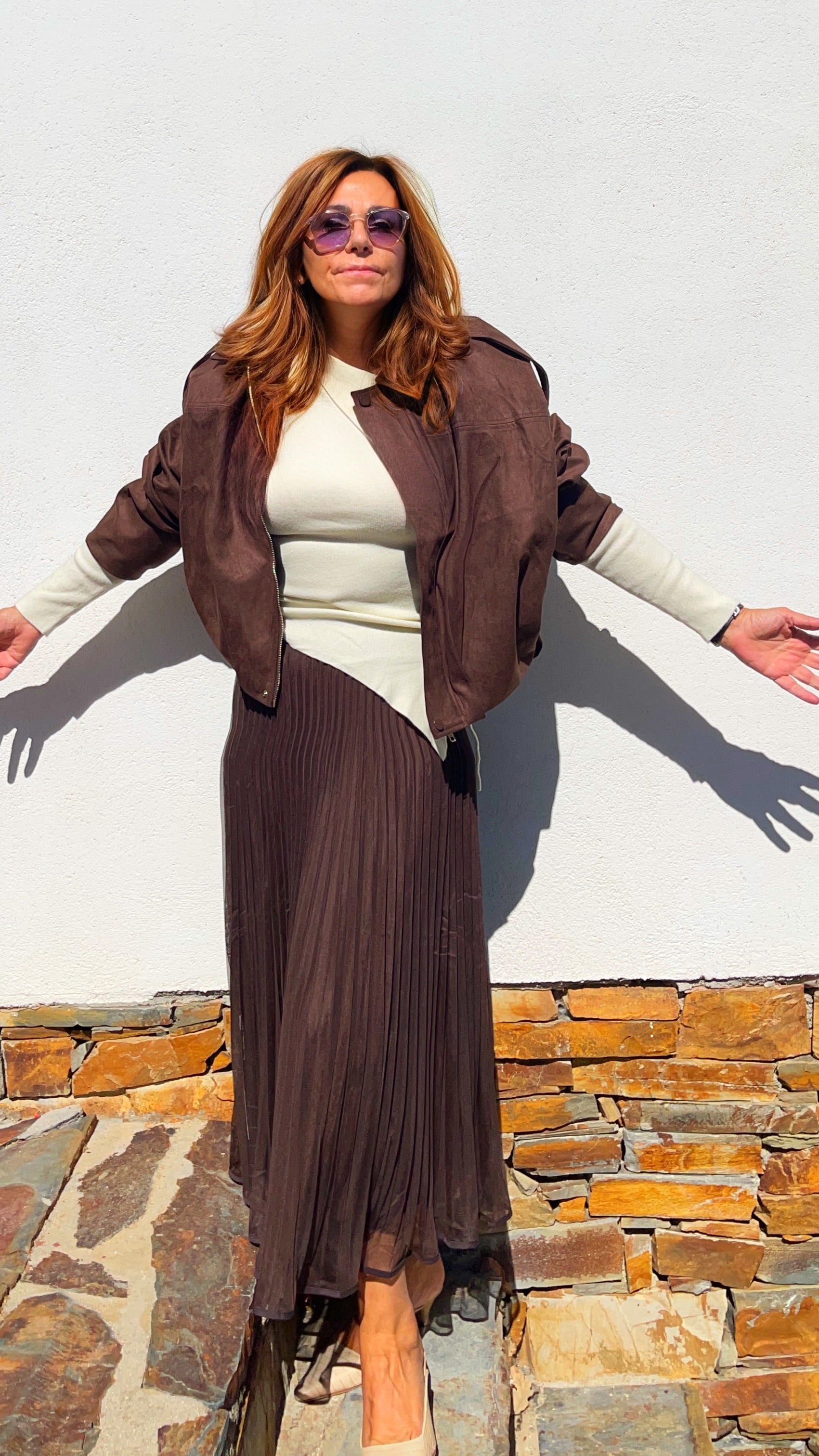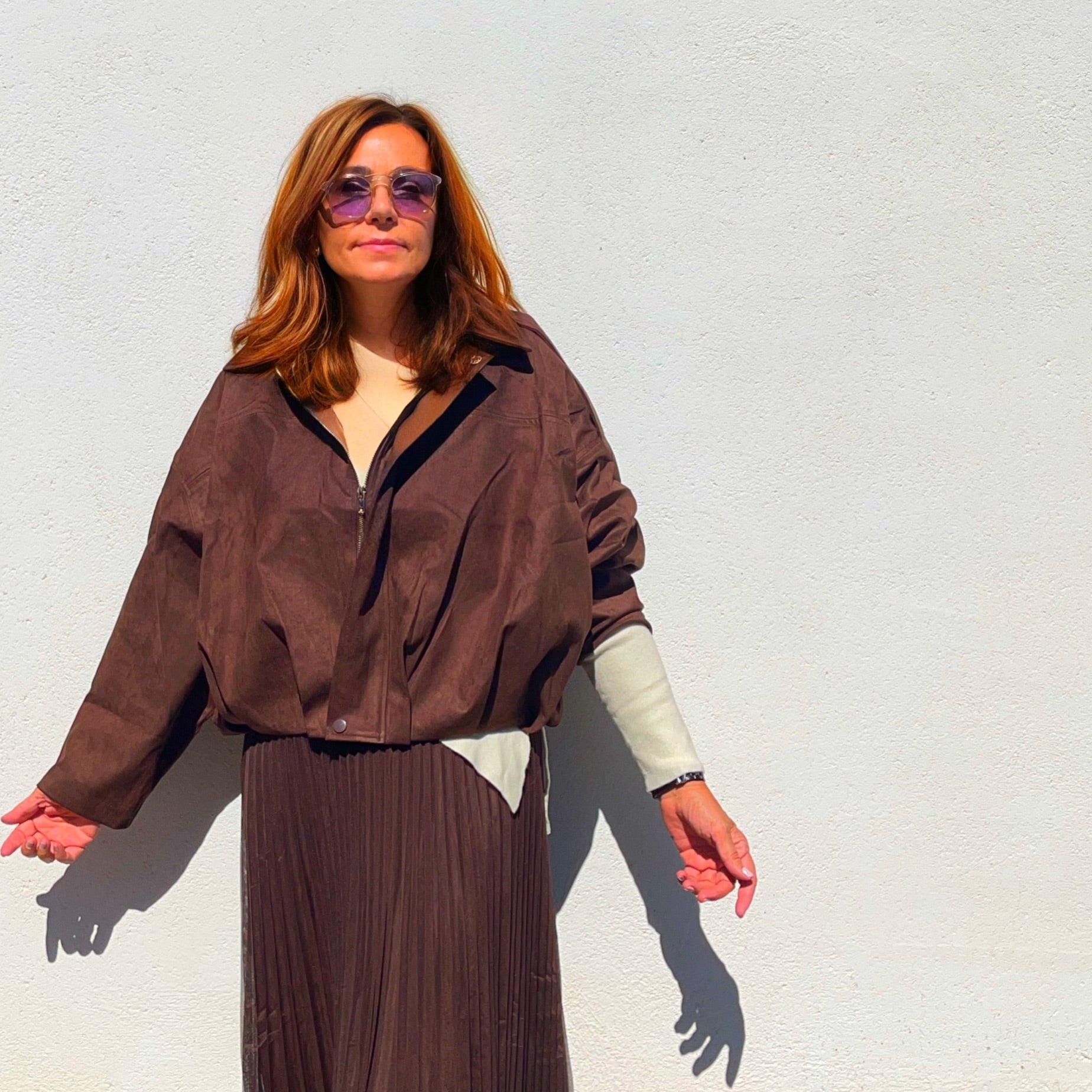 Bomber chocolate en tejido efecto ante con cierre de cremallera y botones, de estilo oversize y muy versátil.